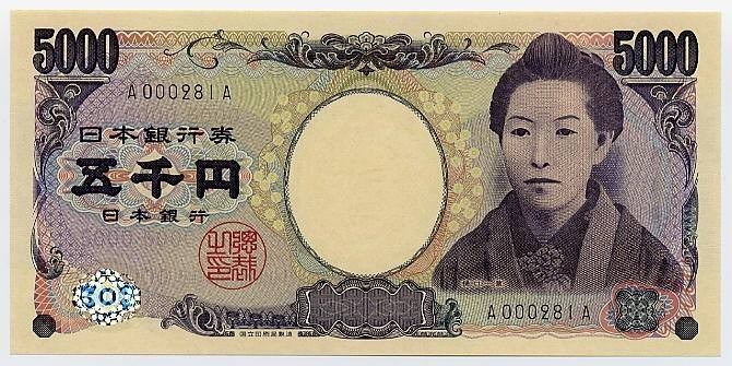 樋口一叶(1872-1896)是日本明治时期的著名女作家。她一生贫寒,24岁英年早逝,她的作品大多反映社会下层人民悲惨生活,因此过去很长一段时间,樋口一叶的形象被人们公认为“明治时期不幸女性的代表”。2004年11月,她的头像被印在了五千日元纸币上。在日本纸币史上广泛流通的货币中,除了樋口一叶,还从未有过女性人物。她不仅是日本近代首位以作家为职业的平民女性,也是日本纸币史上第一位出现在日元纸币正面的女性肖像人物。
