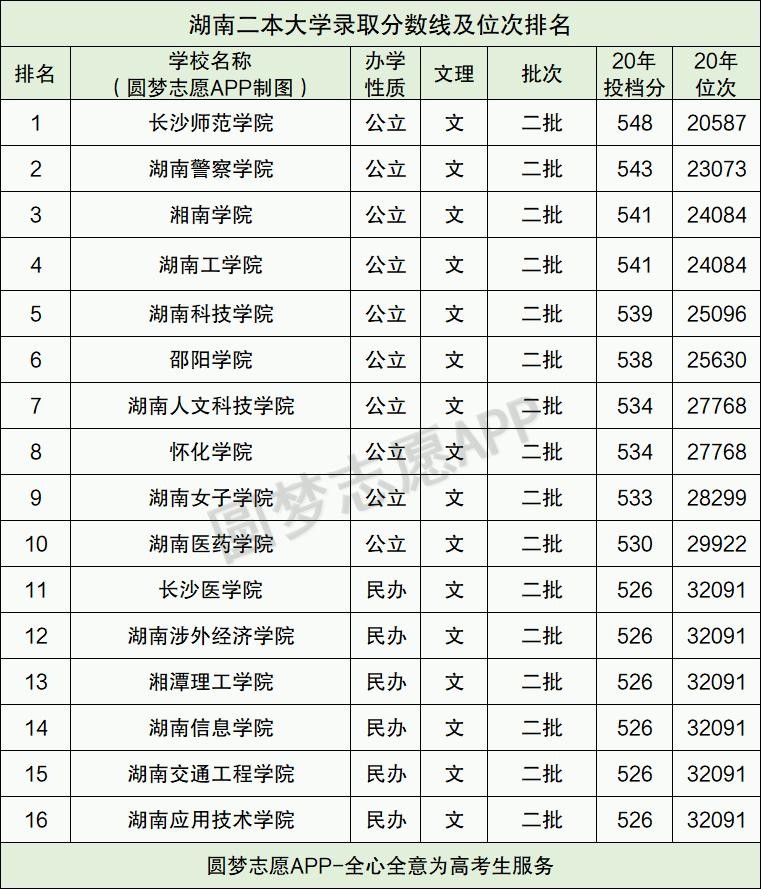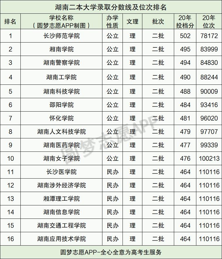 湖南二本各校录取分数线及位次排名