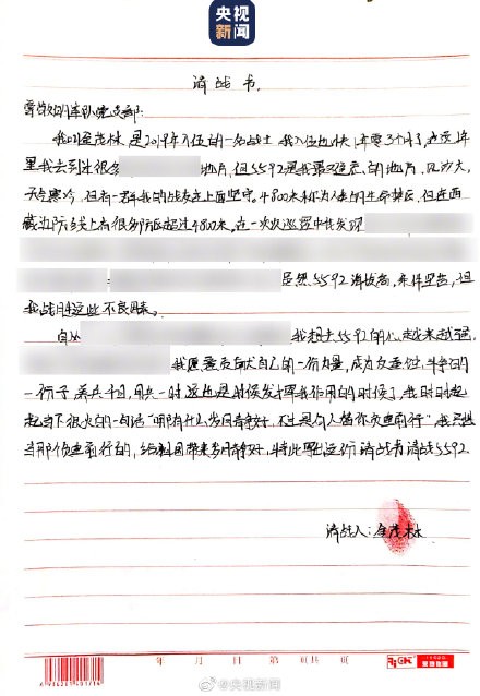 【致敬!边防战士的请战书】“我辈之青年当立志高远,守一方国土,保一方平安”“谁不想家人团聚,那谁又来守卫这面国旗?为了祖国安宁,我早已做好牺牲一切的准备”“我想成为那个负重前行的人,给祖国带来岁月静好”…祖国最高驻兵点5592观察哨官兵说:“宁可向前十步死,绝不后退半步生!”(总台央视记者刘笑宇 高东兴 关美璐)