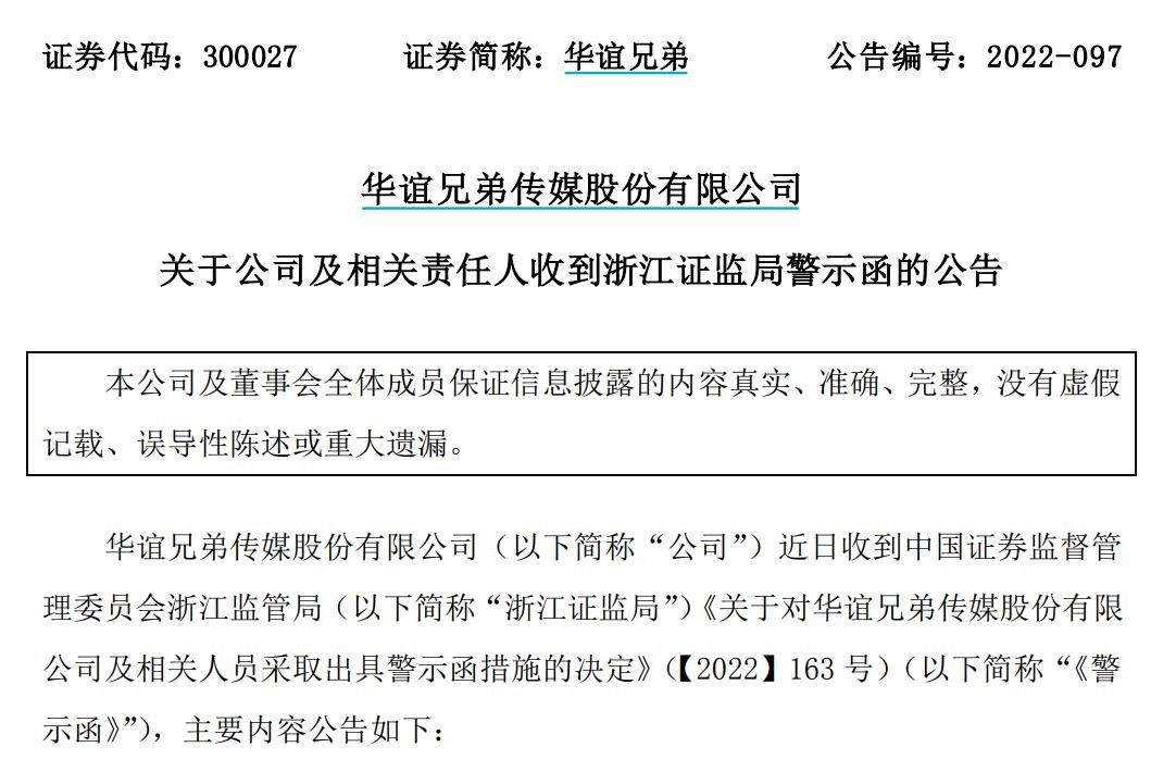 中新经纬12月19日电 华谊兄弟12月19日晚间发布公告称,浙江证监局决定对公司以及王忠军、王忠磊、高辉、丁琪等相关人员分别采取出具警示函的监督管理措施,并记入证券期货市场诚信档案。