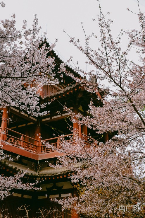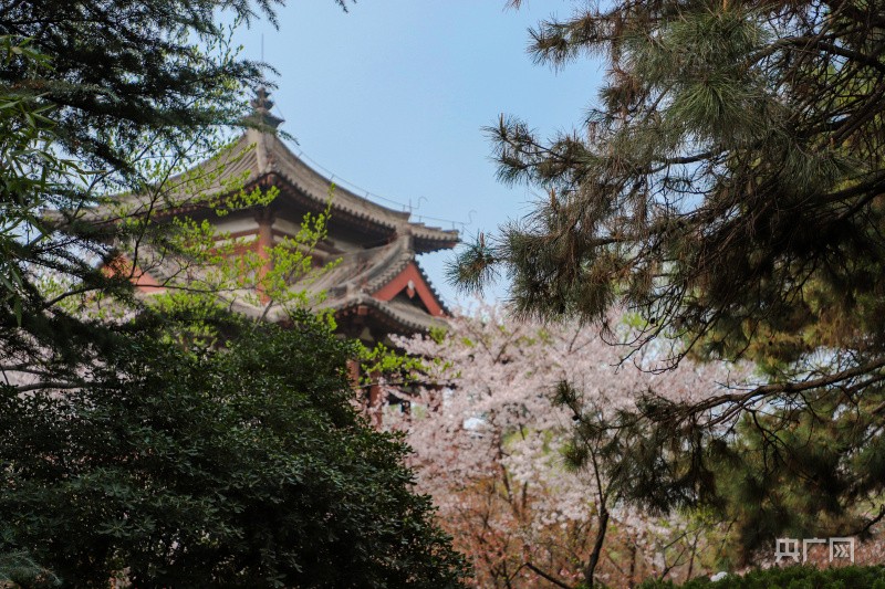 樱花掩映下的云峰阁(央广网见习记者 侯凯奇 摄)