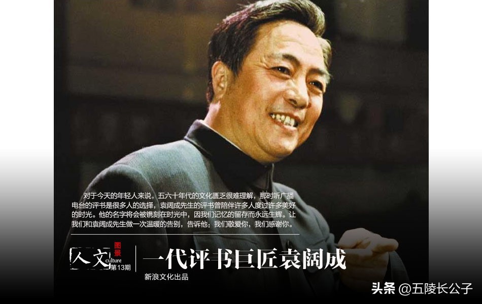 演播《西汉演义》评书,在广播评书盛行的时期,可谓是名家辈出,人人自谓怀荆山之玉、握灵蛇之珠,袁先生独辟蹊径,发挥自己独有和独到的艺术风范与表演气象,成就了这部具有深刻历史感悟和人物共情的评书。