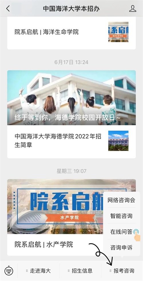2.閫氳繃涓浗娴锋磱澶у鏈嫑鍔炲井淇″叕浼楀彿锛岀偣鍑诲彸涓嬭鈥滄姤鑰冨挩璇⑩€斿湪绾块棶绛斺€濓紱