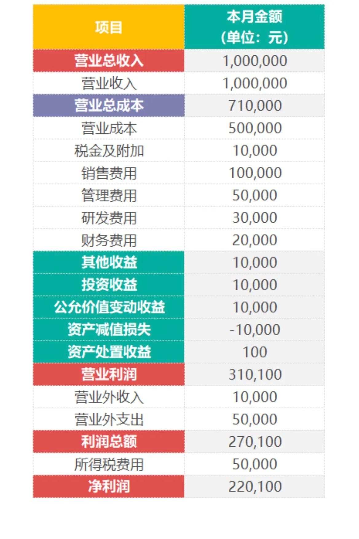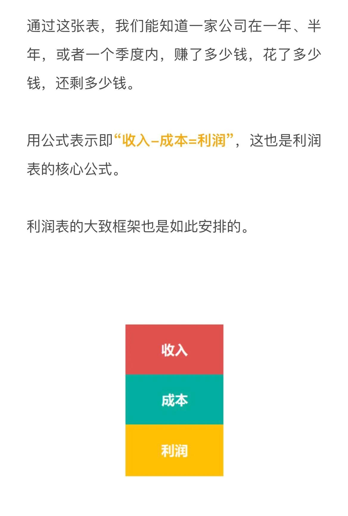 1. 首先,我们了解了利润表包含了三个信息:收入、成本和利润。三者的关系为,收入-成本=利润,这也是利润表的核心公式。