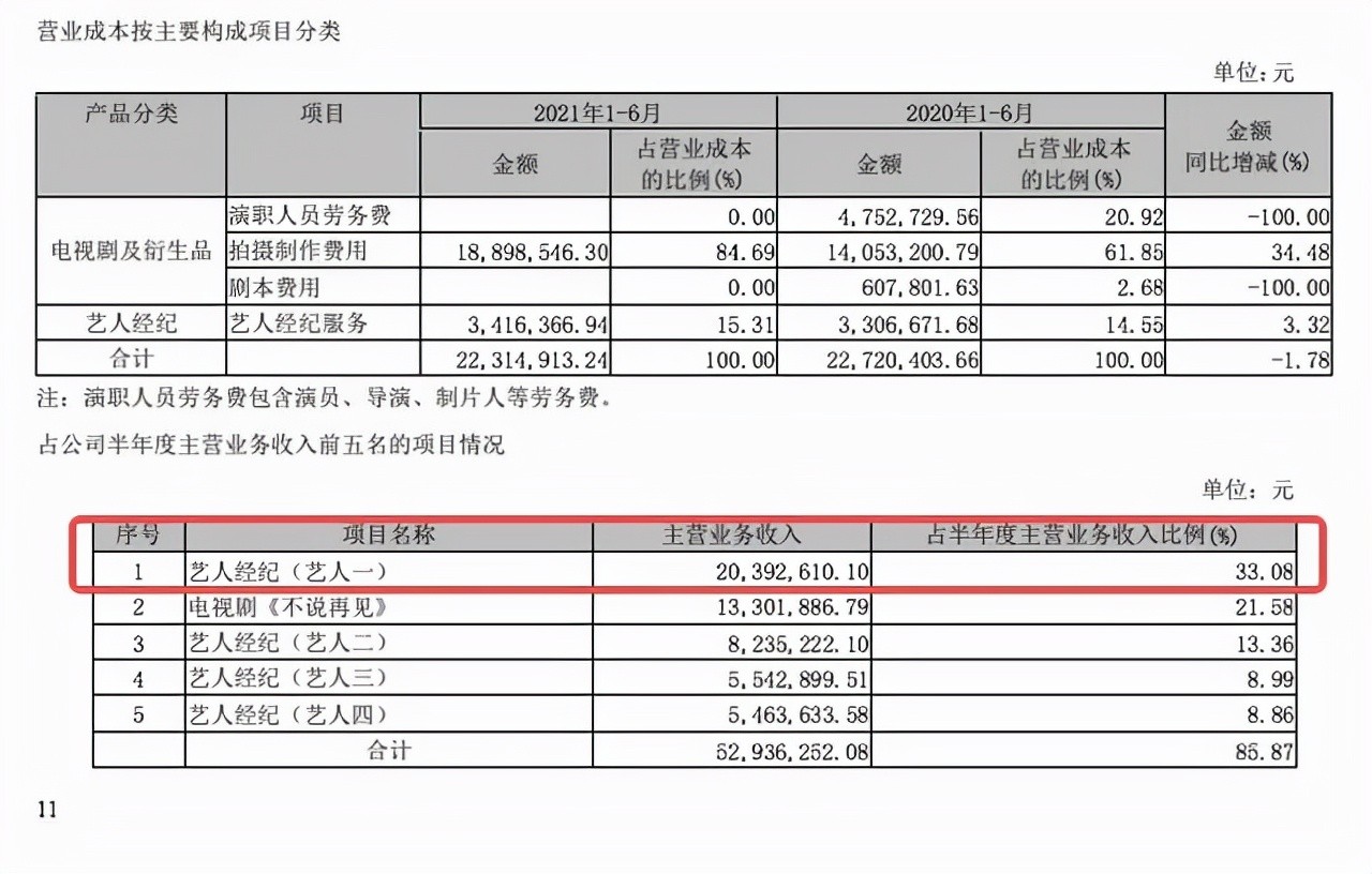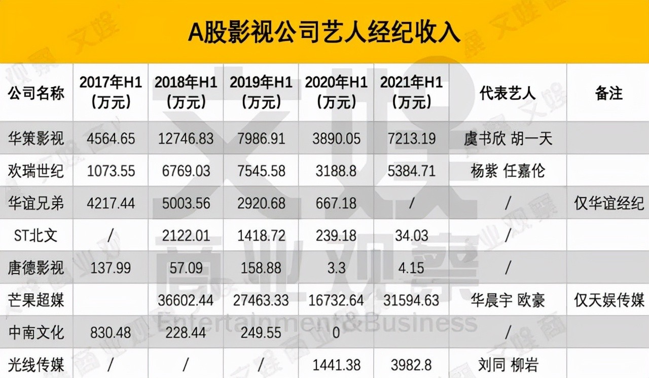 2020年欢瑞世纪的艺人经纪收入首次超过影视剧收入,在总收入中占比超52%;而2021年上半年,这一板块收入为5384.71万元,占总营业收入的比例为87%。