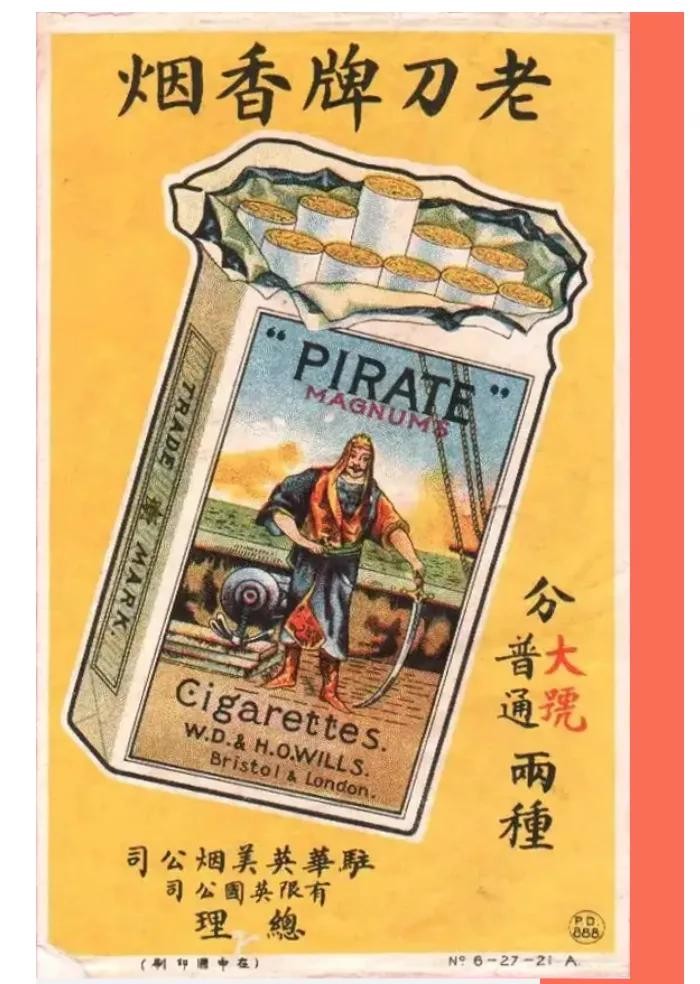 19 老刀牌 是1902年英国惠耳公司推出的一款王牌产品,因其烟盒上印有持刀的海盗人物而得名,因此也被许多人称为“海盗”。