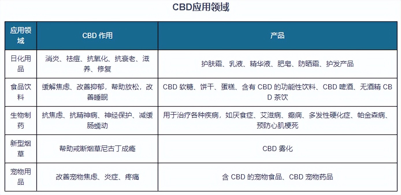 工业大麻花叶中的 CBD(大麻二酚)拥有多种药理作用,包括抗炎杀菌、抗焦虑、抗精神病以及神经保护等功能,可用于治疗厌食症、艾滋病和癫痫等疾病。除医疗用途外,海外成熟市场已将以CBD为主的大麻素添加进更多应用场景中,如日化用品、食品饮料、宠物用品等,CBD未来发展可期。