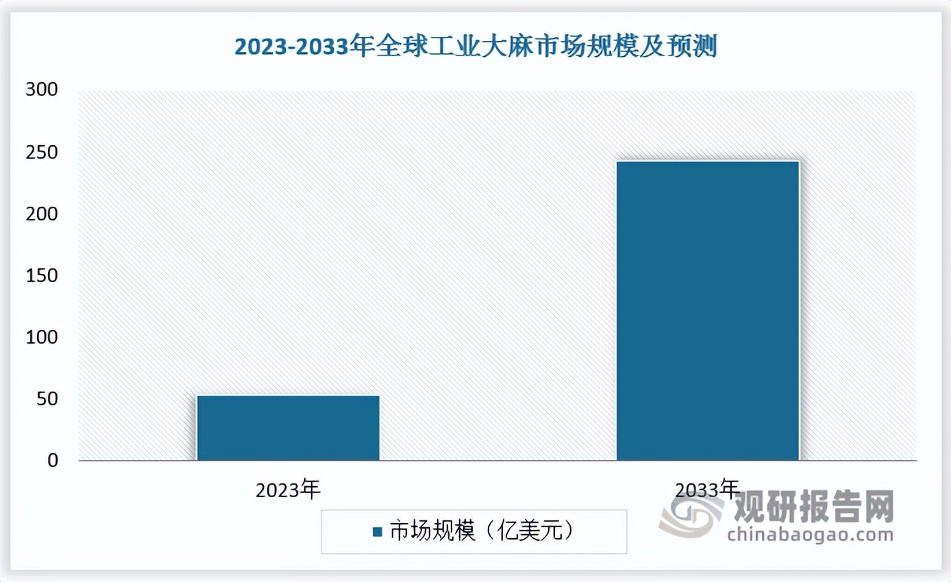 美洲部分地区和欧盟大多数成员国已基本实现工业大麻的合法化,叠加亚洲部分国家工业大麻发展较为迅速,全球工业大麻市场价值将不断扩大。根据数据,2023 年全球工业大麻(不包含 CBD)市场规模为53.8 亿美元,预计2033年全球工业大麻(不包含 CBD)市场规模达243亿美元,2023-2033年全球工业大麻市场规模CAGR 为 16.27%