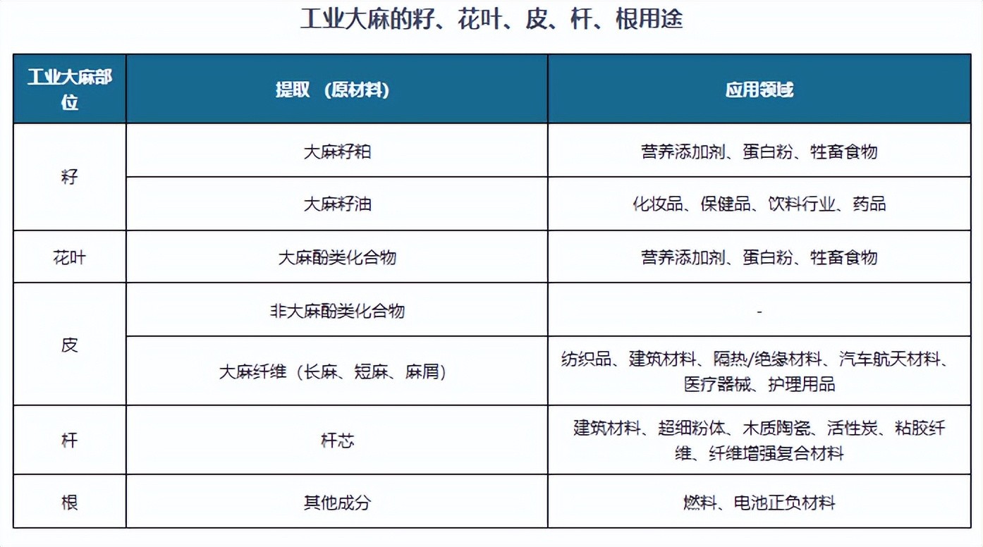 工业大麻用途广泛,工业大麻的籽、花叶、皮、杆、根可应用于纺织、食品、日化、医药等领域。