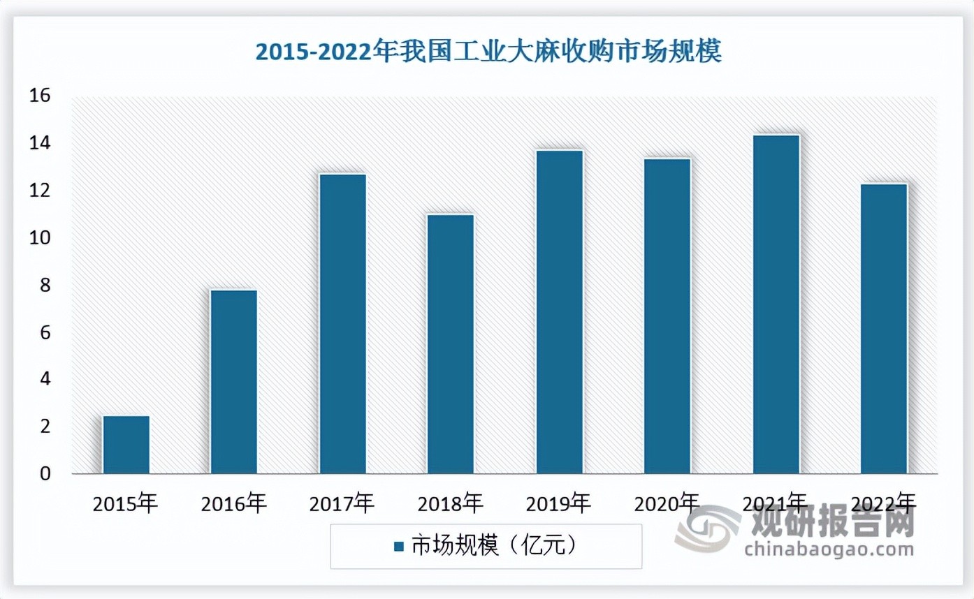 除种植外,各国和国际组织对于工业大麻的应用政策也不尽相同,使得全球工业大麻应用存在差异性。北美地区是全球工业大麻市场最为发达的地区,但随着欧洲种植面积持续扩大,北美的主导地位可能会受到欧洲挑战,与此同时,以中国、日本、印度为代表的亚太地区CBD市场出现显著增长,主要系法律变化影响。数据显示,2015-2022年我国工业大麻收购市场规模由不足3亿元增长至12.3亿元左右。