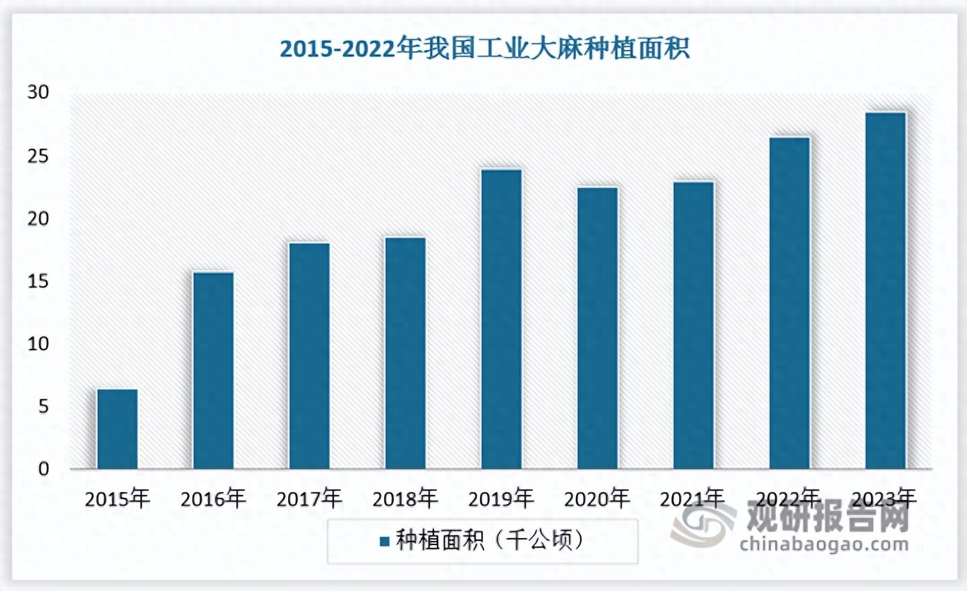 我国工业大麻种植面积相对较小且分布集中。由于我国工业大麻种植审批程序严格,需要接受公安机关的审查之后才有机会获得工业大麻的种植许可证,准入门槛较高,使得国内种植面积较小。根据数据,截至2022年我国工业大麻种植面积约为26.5千公顷。