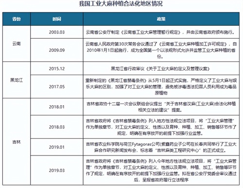 目前,仅有云南、黑龙江、吉林三个省份分别于2010年、2017年、2018年获批可在省级农业科学院的指导下发展工业大麻产业,因此我国工业大麻主产地分布集中。