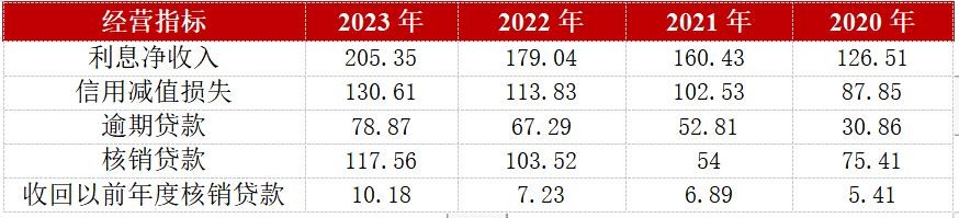 公司2021-2023年核销贷款分别为54亿,103.52亿、117.56亿,贷款核销率分别为4.43%、6.99%、7.31%,受经济下行影响,公司坏账有所增加,核销贷款率上升较快,公司已核销贷款回收率平均在10.8%。