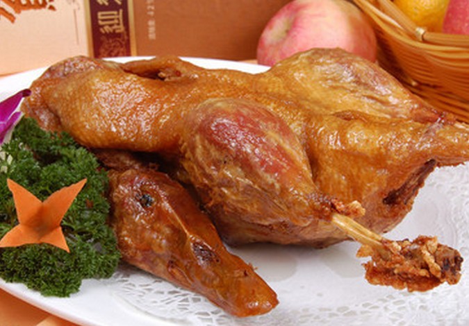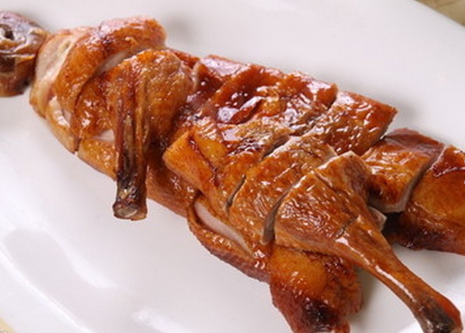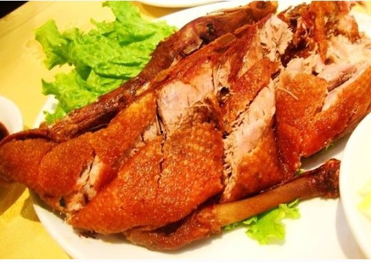 (3)将放凉的鸭子打开.上下均裹一层香葱(如果鸭子不放凉直接裹葱放入油锅中炸鸭皮容易和葱粘在一起易破皮)入五成热的油锅中炸至皮紧(此步骤为了定型),再离火浸炸1分钟(使鸭子炸透)捞出鸭子锅上火烧至五成热时,用此油反复淋鸭子约4一5下(使鸭子皮脆)直至香葱金黄、鸭皮酥脆即可上桌。