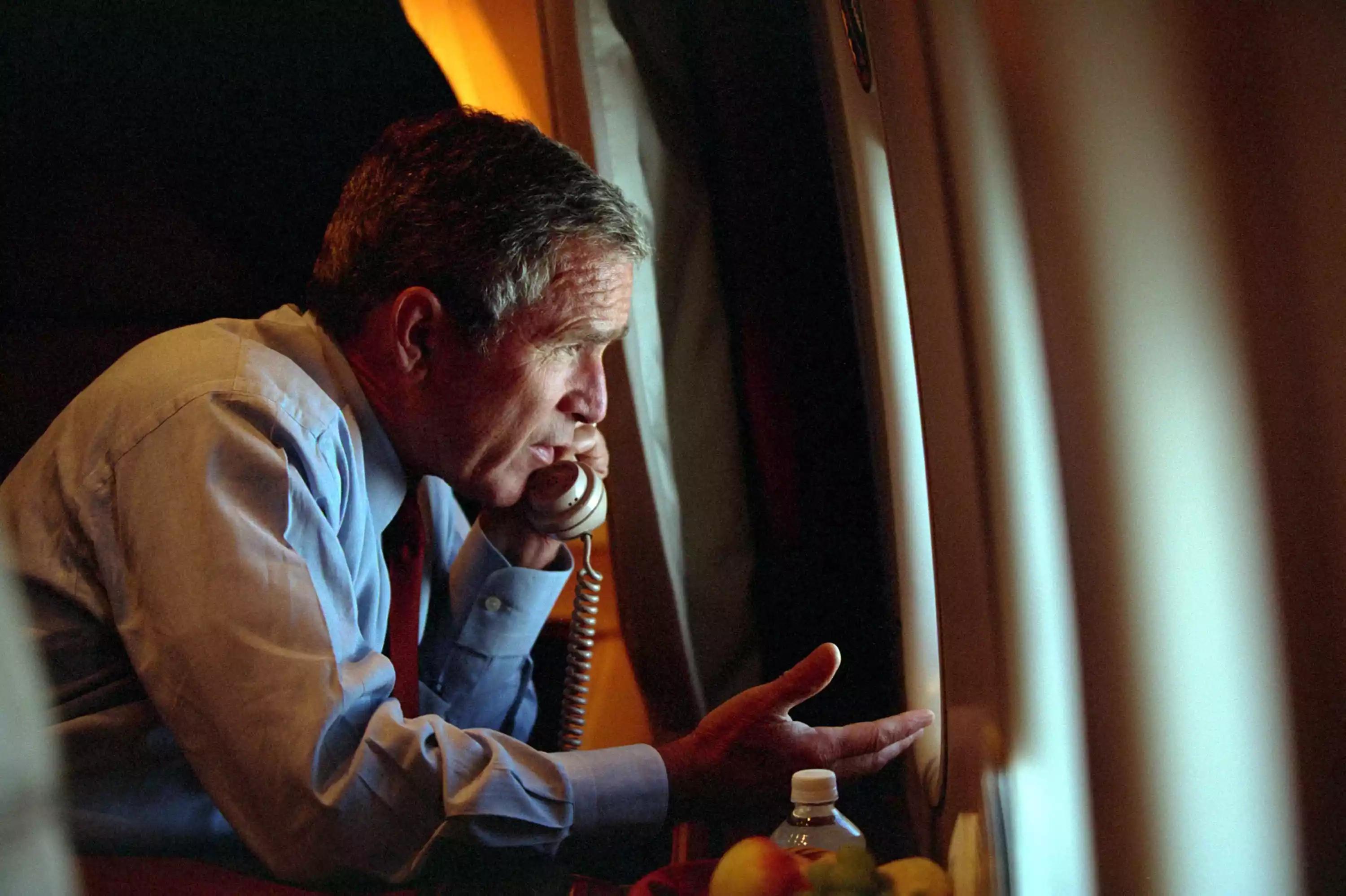 布什总统在 "空军一号 "上讲电话
