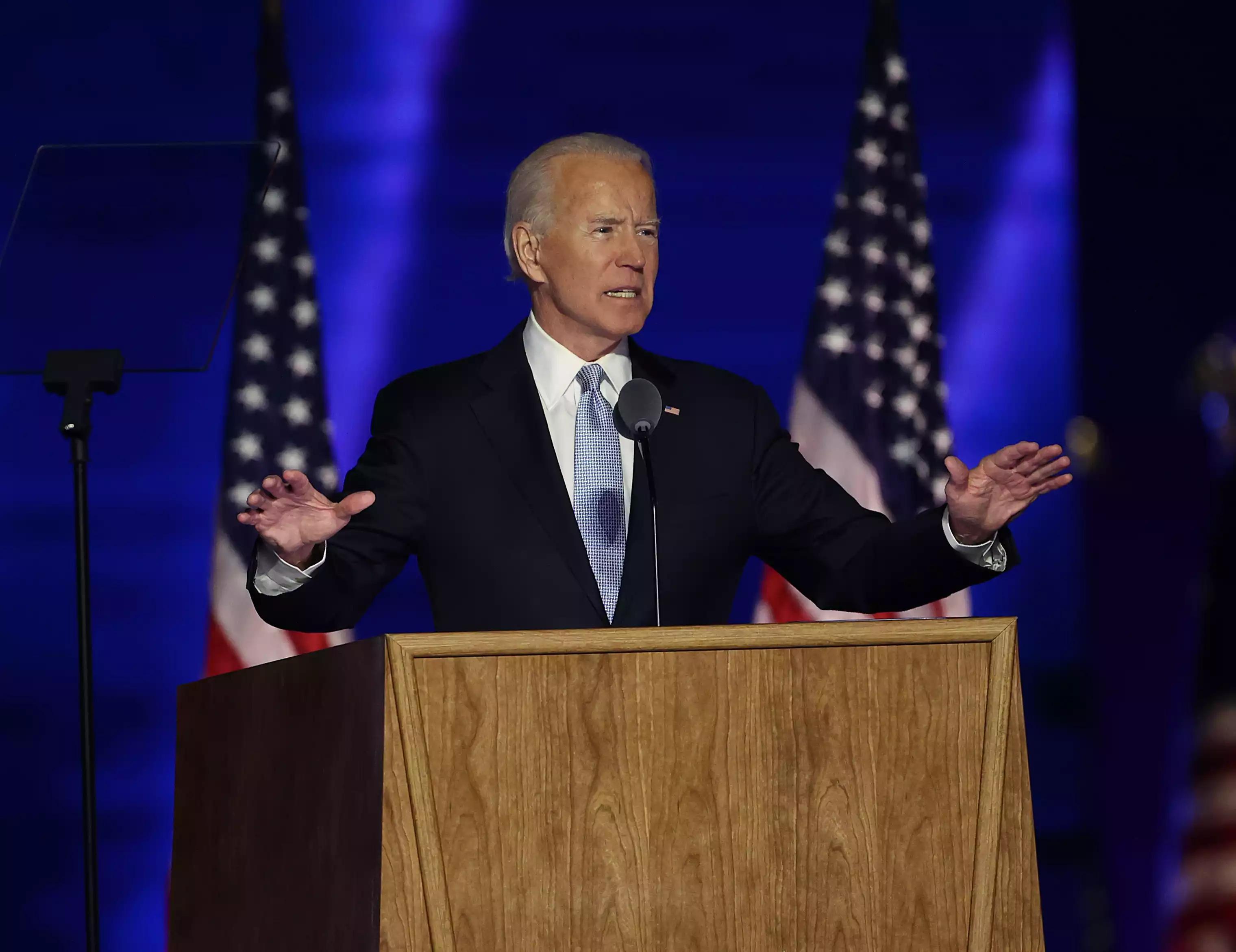 乔-拜登站在讲台上,身后有两面旗帜