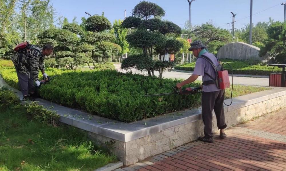绿色代表一个城市的生机,为守护好城市绿地,尉氏县每年春夏季对公园绿篱修剪3次以上,花灌木修剪2次以上,草坪修剪5次以上,秋冬季对树木修枝整形1次以上,旱期全力浇水,保证公园绿植的基本形态和生长。
