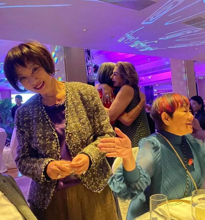 对于继子的婚礼,叶蒨文显然非常重视。她的着装,如同精心挑选的礼物,丝绒西装配上亮片内搭,再配上奢华的胸针和流苏碎钻耳环,她的华贵女明星气场瞬间弥漫开来。
