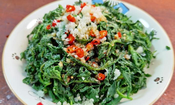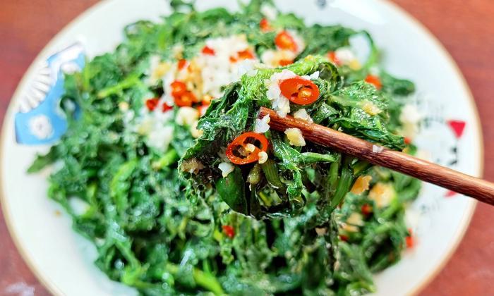 3.将过凉后的刺儿菜捞出,挤干水分,将菜抖开,装入盘中,加入适量的蒜末和小米辣,浇上热油,激发出蒜末和小米辣的香味,然后加入适量的盐、生抽和香油,用筷子翻拌均匀后,即可食用。
