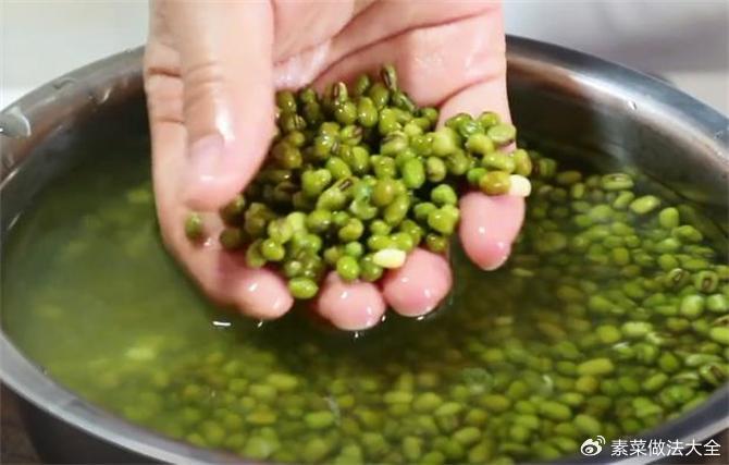 1.首先,我们把绿豆倒入碗中,进行淘洗,洗净后将脏水倒掉。然后,加入开水并没过绿豆,让绿豆在这里浸泡10分钟。