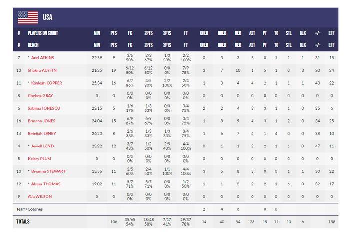 美国队则只有出现11次失误,还有4次是在末节松懈的情况下。全队65中35,命中率54%,三分球17中7,三分命中率41%;全队有6人得分上双,夏奇拉-奥斯汀21分钟拿下19分10篮板3盖帽的数据最为闪耀。