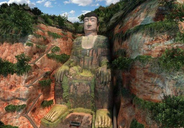 图为拍摄取景地,四川的乐山大佛,“聂人王”与“雄霸”在上面大战了三百回合。