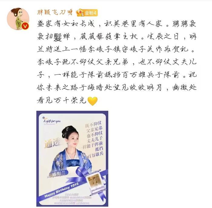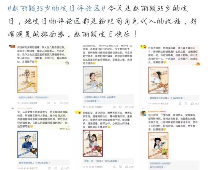 翻开当天她生日动态的评论区,粉丝们用赵丽颖曾经演出的角色做海报,包括《花千骨》《陆贞传奇》等等,海报上面还配有“自由”、“幸福”、“守护”、“蜕变”等寓意美好的关键词。