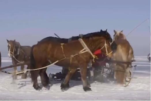 抛完供品,喝完壮行酒,随着鱼把头一声“上冰”令下,冬捕就开始了。查干湖冬捕最壮观的场景就是起网的时刻。收网时,几匹高头大马拉动绞盘牵引着钢丝绳转动,四五米宽的大网裹着冰层下的鱼从宽一米、长两米的出鱼口缓缓露出冰面,渔工们边收网,边将打上来的鱼平摊在冰面上,等在两侧的人们拿着渔场准备的专用编制袋,将一二十斤的大鱼收入囊中。这就是查干湖冬捕最为著名的景观“万尾鲜鱼出玉门”。