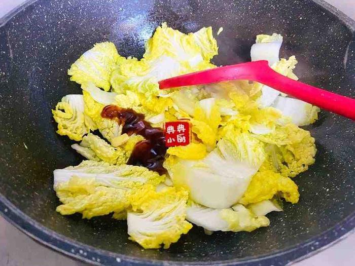 娃娃菜炒软烂之后加一点蚝油翻炒均匀。