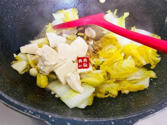 把豆腐倒进去,简单翻拌几下,加适量开水煮一会儿。