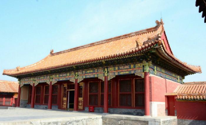 【寿康宫】寿康门内正殿即寿康宫。殿坐北朝南,面阔5间,进深3间,黄琉璃瓦歇山顶,前出廊,明间、次间各安三交六 菱花 扇门4扇,梢间为三交六菱花槅扇槛窗各4扇,后檐明间与前檐明间相同,其余开窗。
