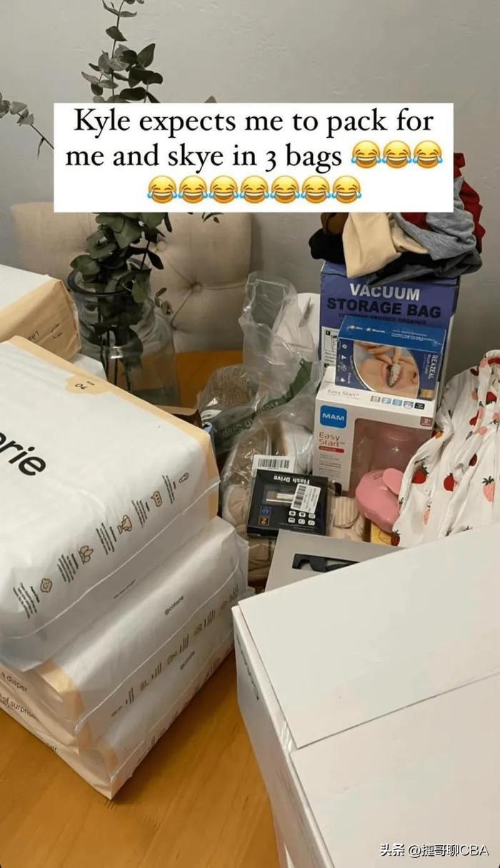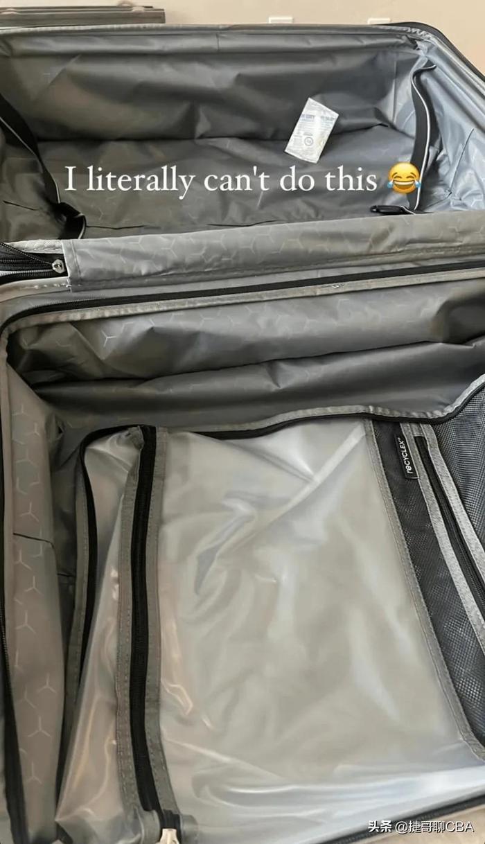 又在17号晒出通宵观看辽宁男篮的比赛,第二天一早起来收拾行李,表示自己做不到,然后把女儿放在行李箱表示收拾好了。