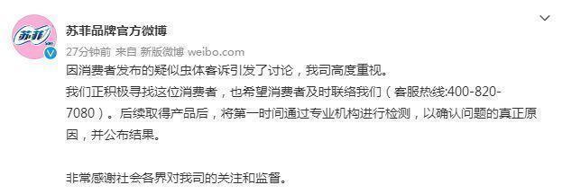 7月28日午间,苏菲品牌官微发布声明称,因消费者发布的疑似虫体客诉引发了讨论,我司高度重视。我们正积极寻找这位消费者,也希望消费者及时联络我们。后续取得产品后,将第一时间通过专业机构进行检测,以确认问题的真正原因,并公布结果。