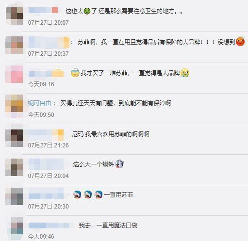 对此,有网友表示:“苏菲啊,我一直在用且觉得品质有保障的大品牌!没想到...”、“我才买了一堆苏菲,一直觉得是大品牌”、“一直用苏菲”...