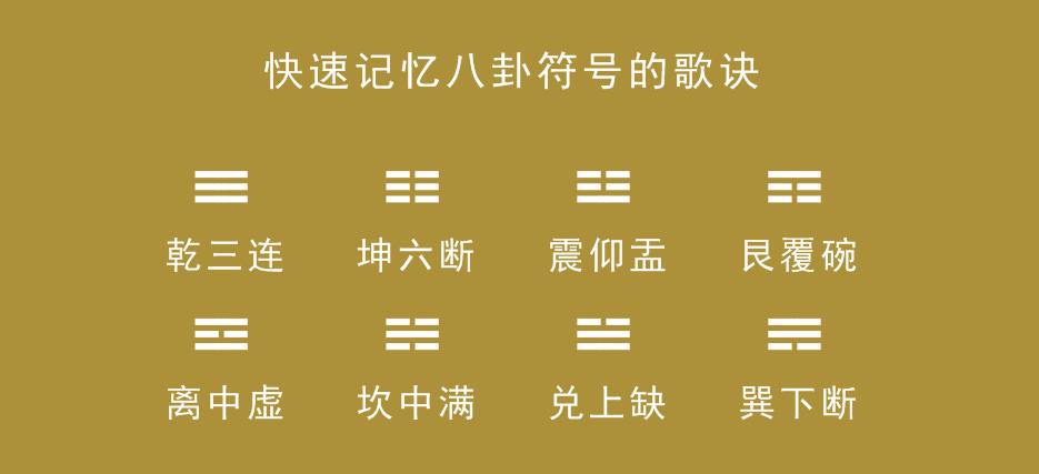 八卦是由三根阳爻或阴爻组成,分别是乾(qian)、兑(dui)、离(li)、震(zhen)、巽(xun)、坎(kan)、艮(gen)、坤(kun)。