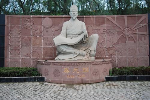 秦九韶(公元1202~1261年)南宋,数学家。他在1247年(淳佑七年)著成『数书九章』十八卷.全书共81道题,分为九大类:大衍类、天时类、田域类、测望类、赋役类、钱谷类、营建类、军旅类、市易类。这是一部划时代的巨着,它总结了前人在开方中所使用的列筹方法,将其整齐而有系统地应用到高次方程的有理或无理根的求解上去,其中对「大衍求一术」﹝一次同余组解法)和「正负开方术」﹝高次方程的数值解法)等有十分深入的研究。其中的”大衍求一术”﹝一次同余组解法),在世界数学史上占有崇高的地位。在古代<孙子算经>中载有”物不知数”这个问题,举例说明:有一数,三三数之余二,五五数之余二,七七数之余二,问此数为何?这一类问题的解法可以推广成解一次同余式组的一般方法.奏九韶给出了理论上的证明,并将它定名为”大衍求一术”。