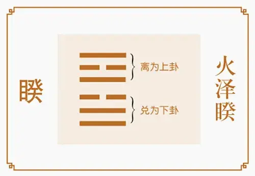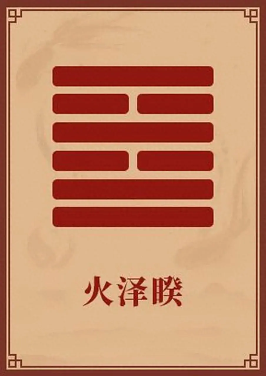 易经六十四卦中的第三十八卦是睽卦,也写作火泽睽(huǒ zé kuí)。睽卦是由下兑上离两个单卦组成的,兑卦代表泽,居于下位;离卦象征火,处于上位。卦象显示了水泽在下、火焰在上的状态,二者性相异而位置相反,形象地表达了“睽”的含义,即分离、不合、矛盾或对立。