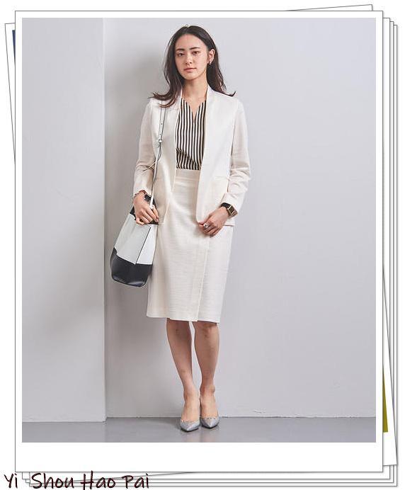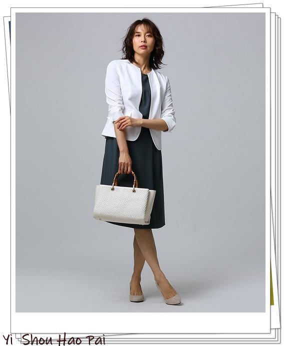 搭配白色无领外套和黑色连衣裙。如果你将女士手提包选择竹制提手的包包,你将获得简单而优雅的办公室装束。通过使用黑色和白色两种颜色来追求简洁的look。