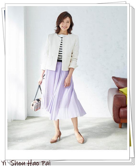 粗花呢白色外套非常适合在正式场合穿着,也建议在内部穿上条纹衬衫。对于底部,请选择不对称女士百褶裙。为什么不选择一条现在很流行的薰衣草色裙子呢?
