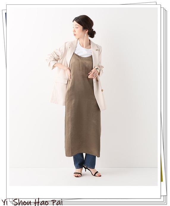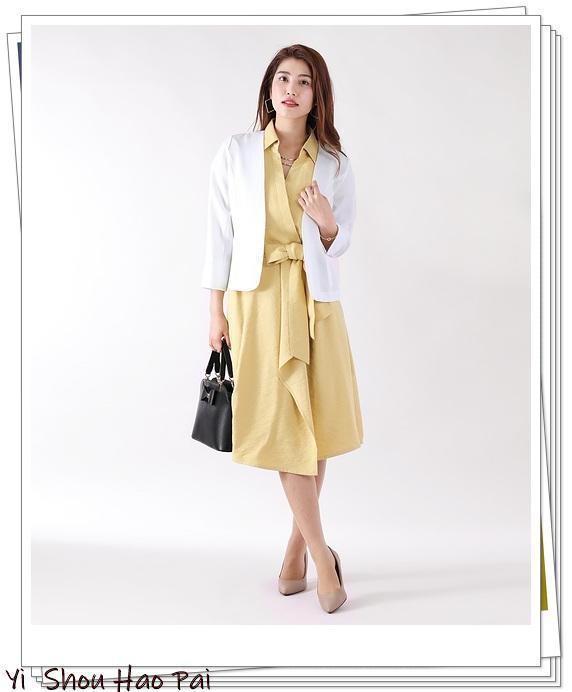 金色的系带连衣裙,兼具女人味和清新感。如果结合使用白色无领外套进一步提高简洁度,则可以实现完美的通勤造型效果♪搭配米色高跟鞋搭配成熟外观时,腰部的系带营造出可爱感。