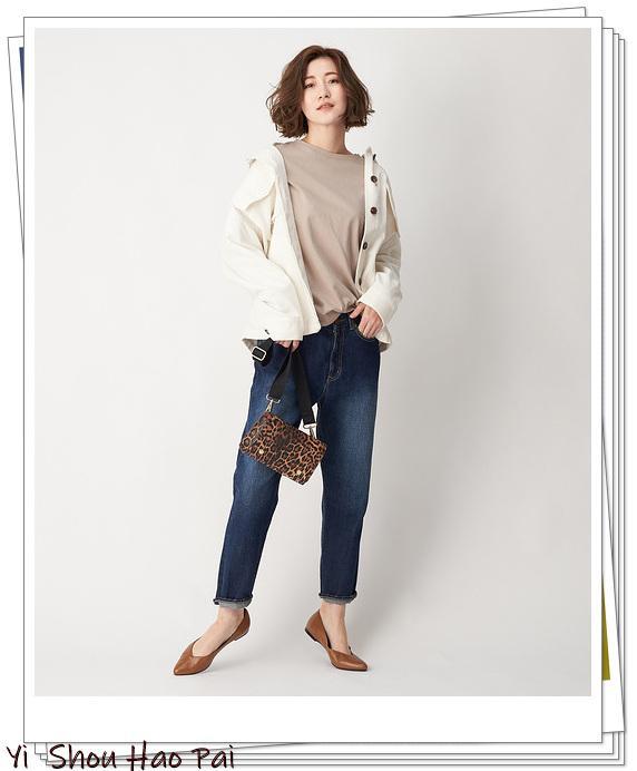 白色的灯芯绒外套。米色T恤和牛仔裤的自然休闲感会增强你的亲切感觉,使用皮革鞋和豹纹包的最佳细节完成你的迷人造型。