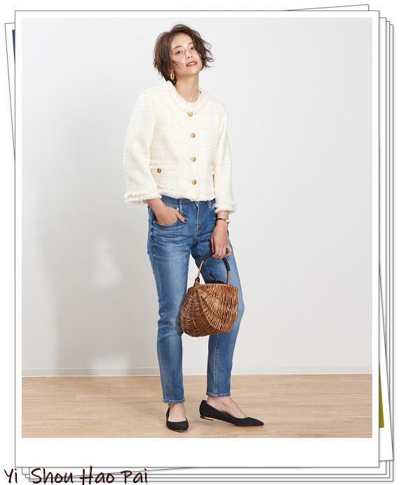 对于外观优雅的白色花呢夹克,选择了牛仔裤搭配。如果穿黑色平底鞋,肯定会收紧造型。搭配篮子包,呈现出法式风情的春季造型风格。