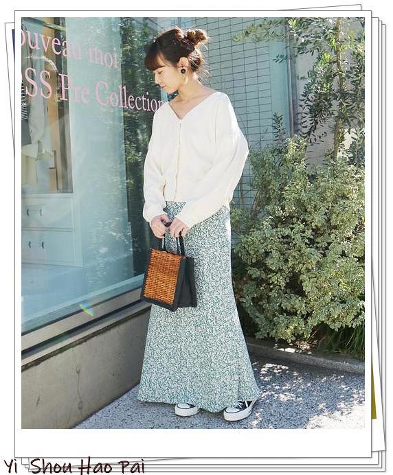 白色V领短外套,柔软的面料,它结合了浪漫和新鲜感,并搭配浅绿色碎花裙。深色篮子袋和浅色的造型,适合春季的look!