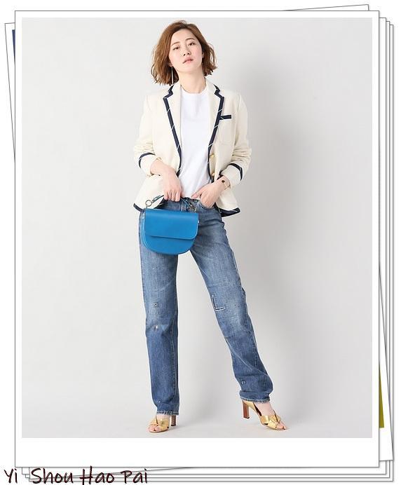 学院风格的白色西装外套,为何不大胆地在底部穿牛仔裤,在内部穿白色T恤呢♪宝蓝色女士包作为亮点。白色x宝蓝色搭配,休闲x知性。