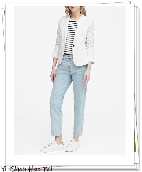 条纹衬衫作为内搭穿在亚麻材料制成的白色外套的里面,外观清新。在浅蓝色牛仔长裤的搭配中享受海洋外观的白色西装风格。白色运动鞋将使白色西装看起来更加清爽轻盈。脚踝是时尚看点,你可以期待精致的外观和时尚的造型。