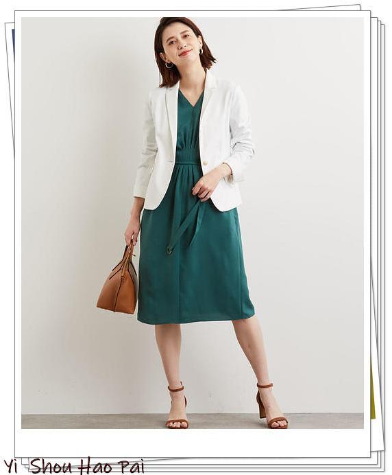 一条收腰的绿色连衣裙,增强女人味。较深的绿色使你看起来更甜,更成熟。与你的白色西装搭配后,营造出干净利落的外观。如果你附上具有复古质感的皮包,则可以享受精致的造型感觉!