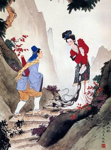 早在魏、晋时期,左思就在《魏都赋》里记载了“连眉配犊子”的爱情故事传说:“犊子牵黄牛,游息黑山中,时老时少,时好时丑。后与连眉女结合,俱去,人莫能追……”后来这一典故衍化为“白蛇闹许仙”故事。故事的女主人公也由“连眉女”衍变为白蛇。