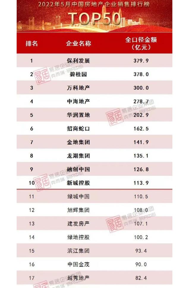 6月1日,5月中国房企销售额排行榜发布,保利发展名列第一,第三名距离它差了80个小目标。