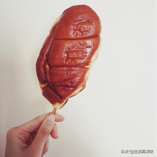 各位小伙伴还记得这个形状像鸡腿的面包吗?用一个竹棒子插在面包里,面包中间一般有一个非常短的火腿肠,还有豆沙馅,外皮焦黄油润。童年的时候能咬着这样的一个大鸡腿回家,是一件非常拉风的事情。
