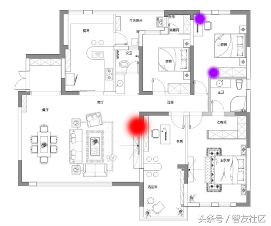 其中红点为无线路由器摆放位置,两个蓝点分别为传输数据设备的摆放位置。